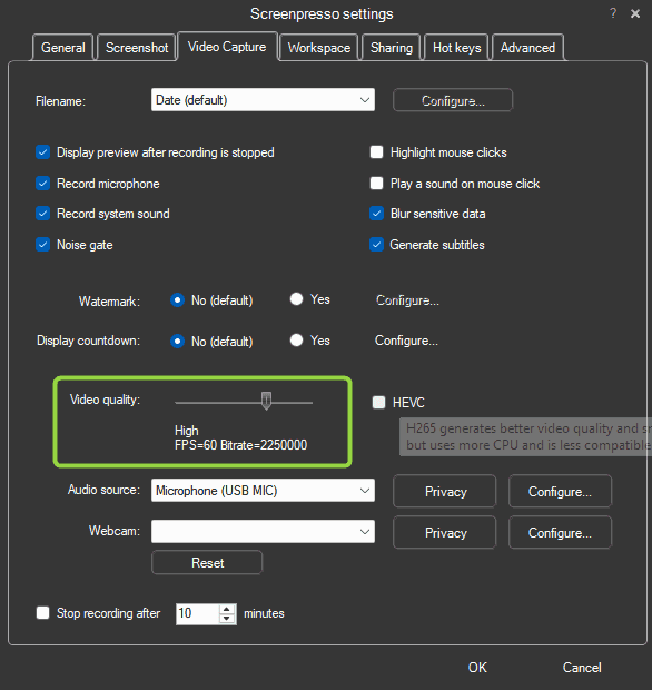 You can now record video with the HEVC codec. HEVC can create smaller MP4 files with better quality, but it may be less compatible on some computers. It is disabled by default and can be enabled in settings.