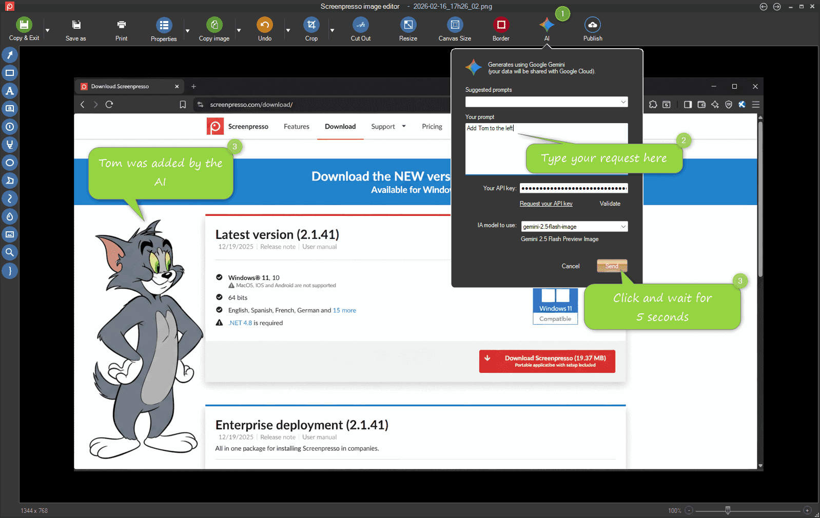 In the built-in image editor, you can ask AI to modify your screenshot.